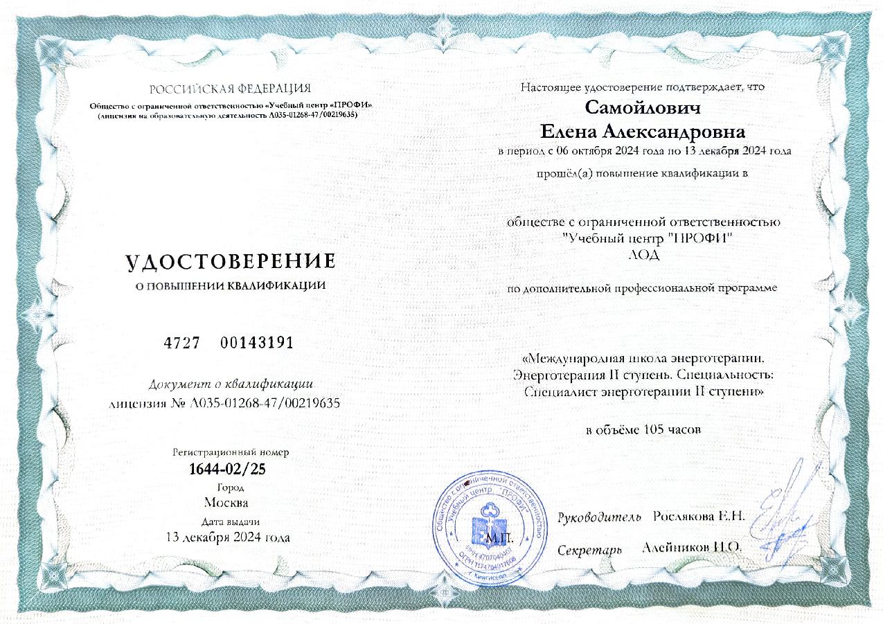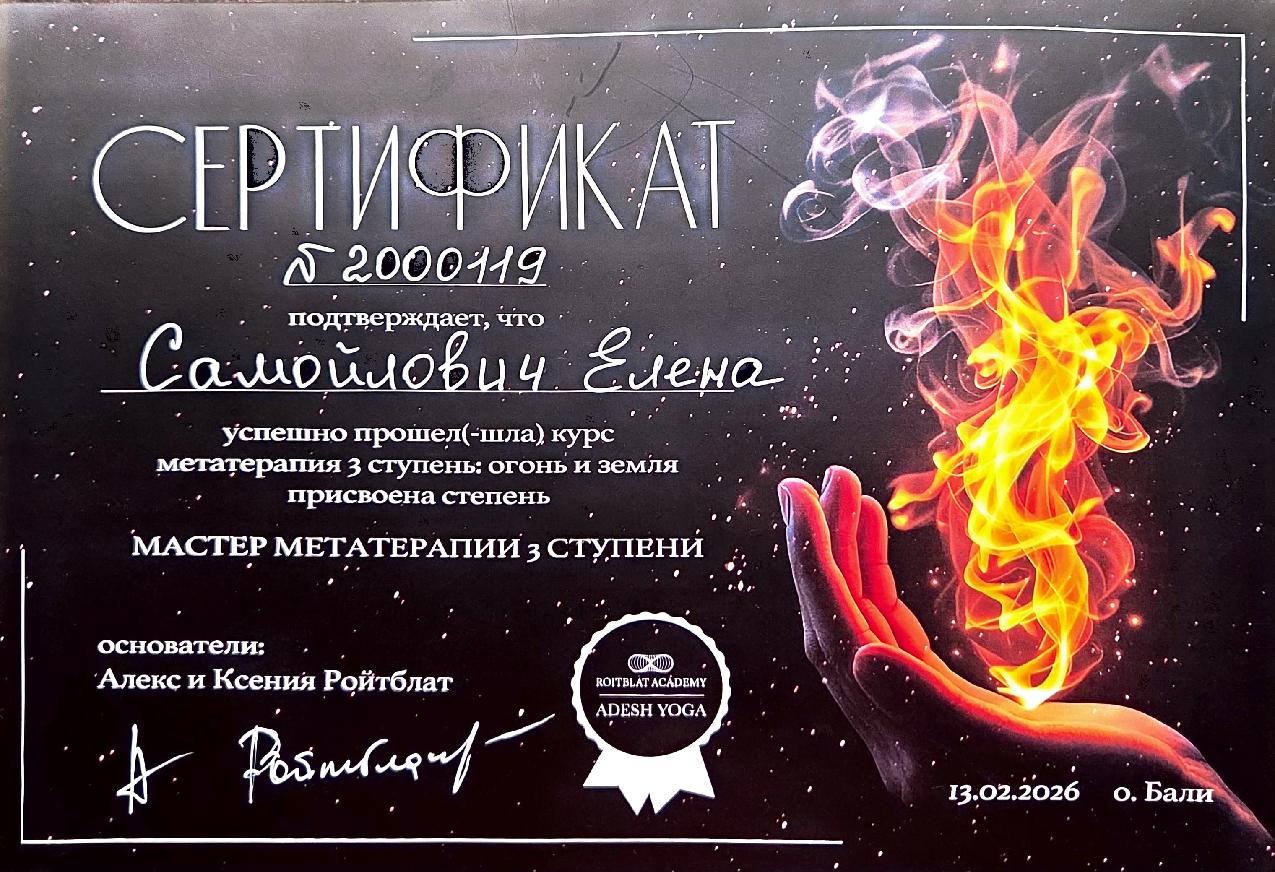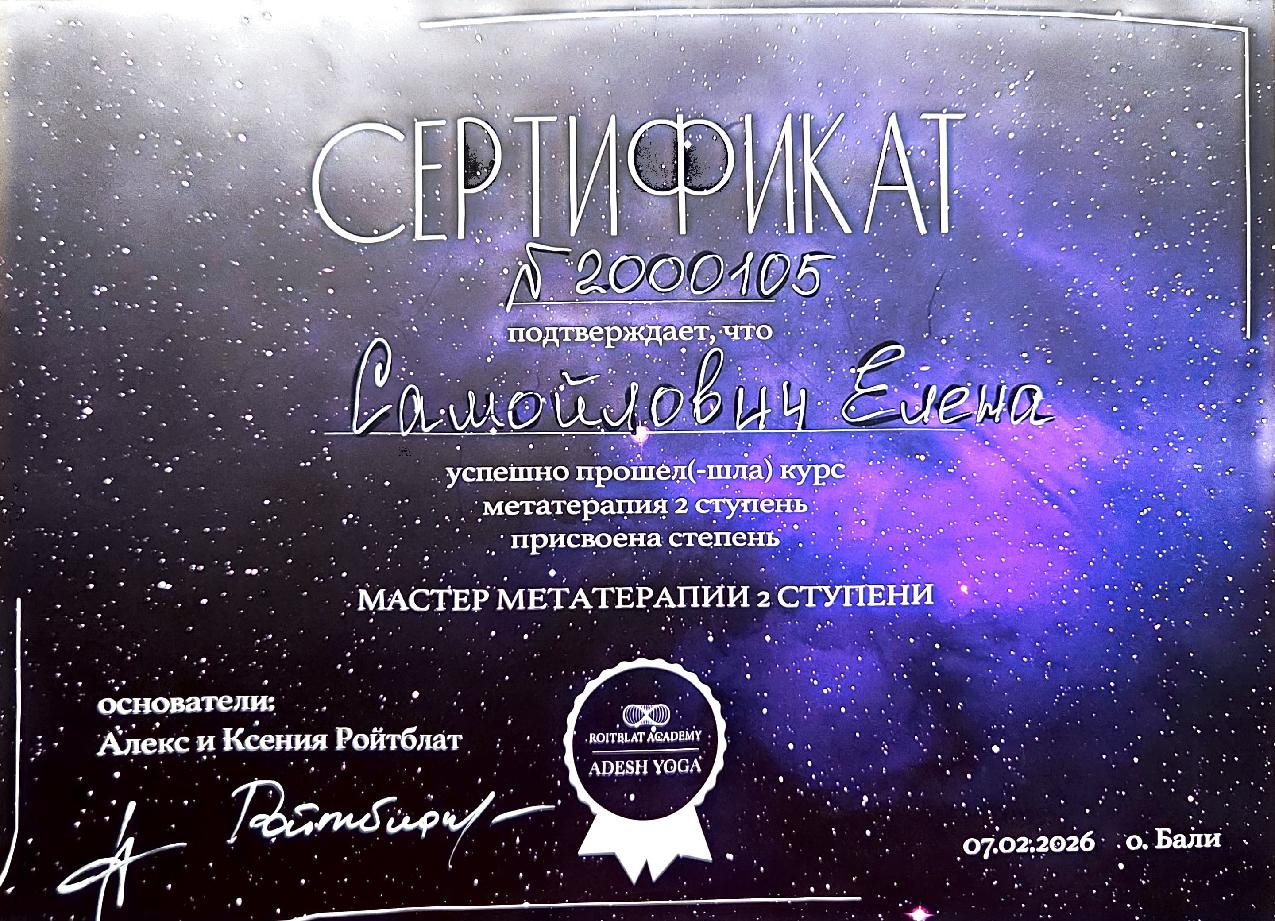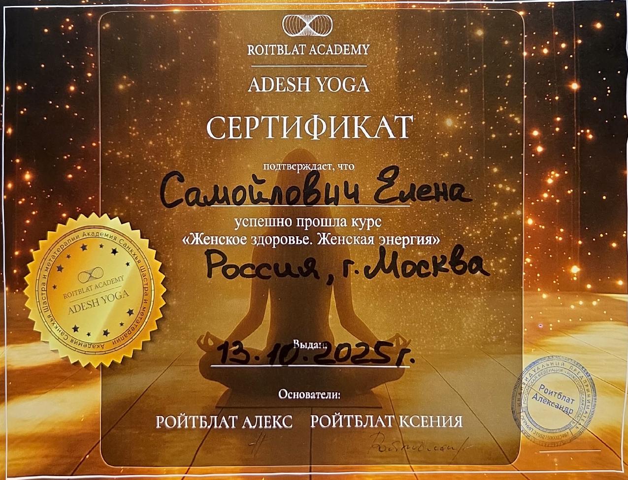 Мое образование — цифровой психолог, метатерапевт, и мастер АДЕШ ЙОГИ. В основе — философия истинных знаний Санкхья Шастра и постоянная практика. Моя задача — найти причину в тонком теле и убрать её. Мы работаем комплексно: психика, тело, энергия.